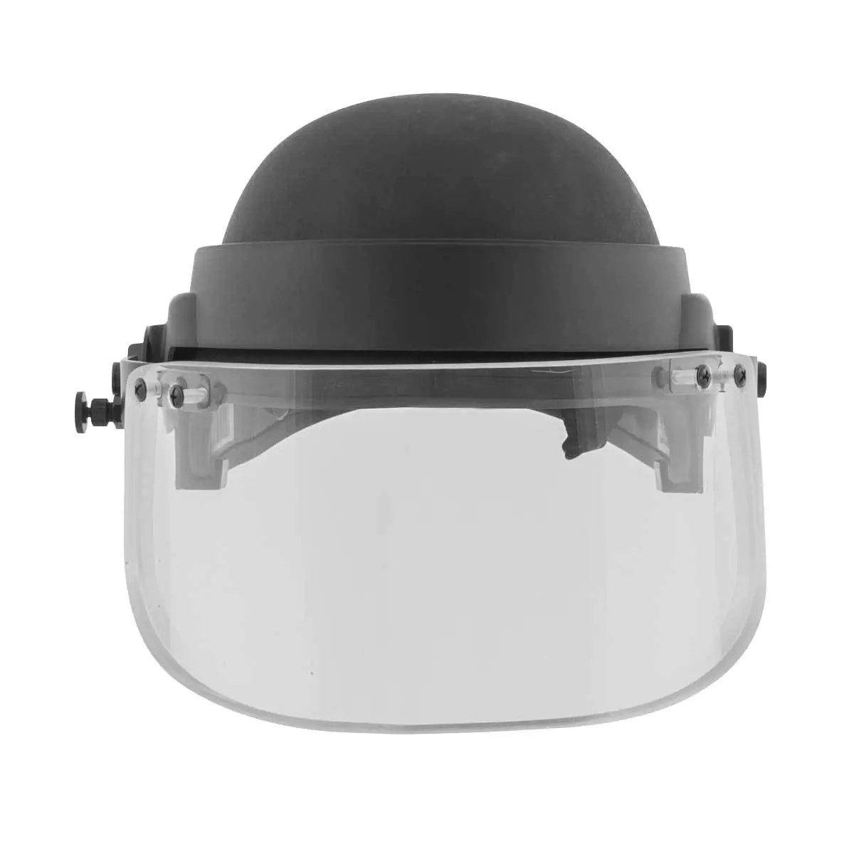 The Ballistic Visor provides protection against multiple hits of NIJ Level II (9mm and .357) and IIIA 9mm rounds and .45 caliber. It weighs 2.2 lbs. The visor can securely be mounted to the PASGT (Personnel Armor System for Ground Troops) and/or M88 helmet via a form-fitted polymer visor band with adjustable rear lock.